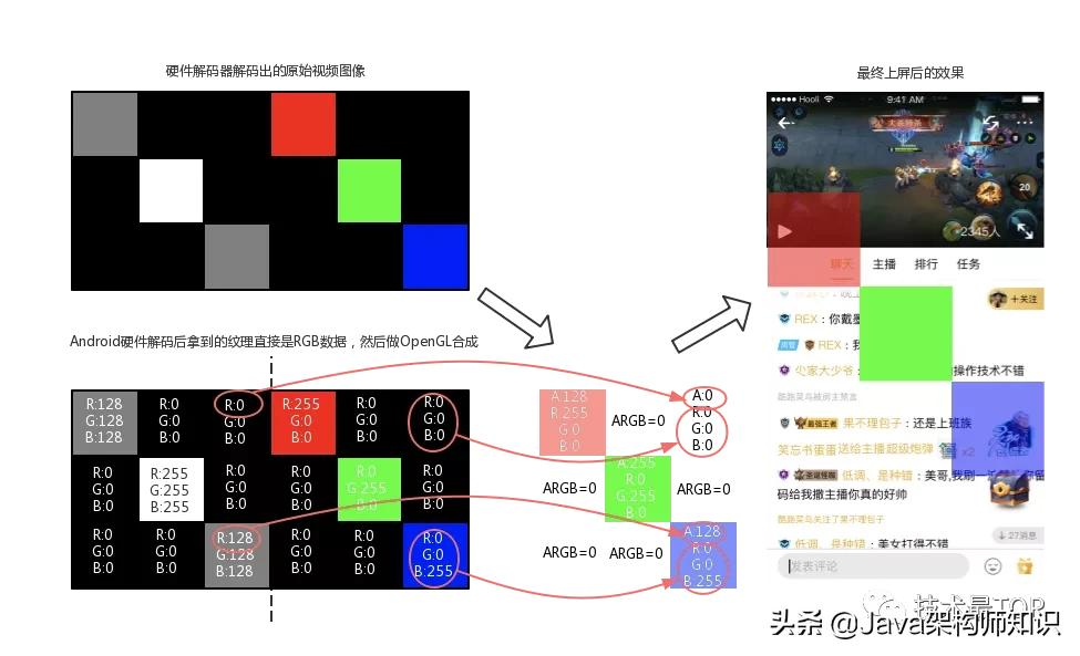 H264解码出来每一帧的数据是YUV,转换为RGB后是不带Alpha通道的,而我们可以在视频中额外开辟一块区域,在RGB通道里存储Alpha的值,最后利用OpenGL将这些数据合成为ARGB图像(带透明通道的图像)。