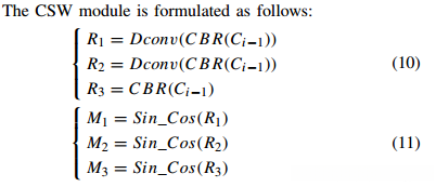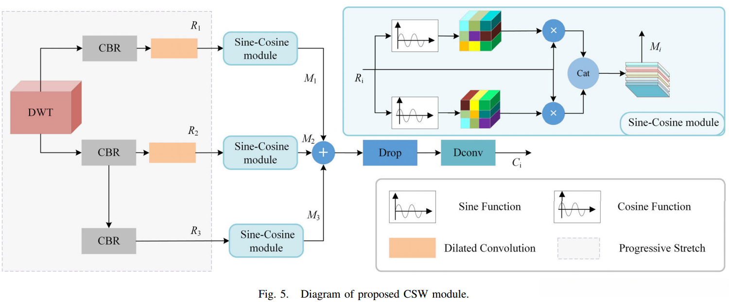 所提出的级联正弦波(CSW)模块的架构如图5所示,包含三个分支。对于前两个分支,接受野通过扩张性卷积扩展[78]以捕获周围信息。