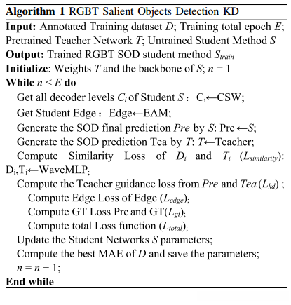 •通过知识蒸馏技术提升RGB-T目标检测(SOD)性能,在预训练权重较轻的学生WaveNet模型中融入教师网络的知识表示,并显著提升了模型的有效学习能力。