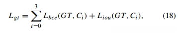 在图2所示的底部浅蓝色虚线箭头位置上,在模型训练期间, 我们对每个解码器附加目标跟踪(GT)指导, 以加快收敛速度. 考虑到整体性和局部性信息, 我们采用了交并比值(intersection-overunion, IoU)损失函数[80]用于衡量相似程度的同时关注重叠区域的重要性. 同时, 为了保证所有像素之间的平滑梯度, 我们应用了像素级二进制交叉熵(BCE)损失[81]. 其定义如下: