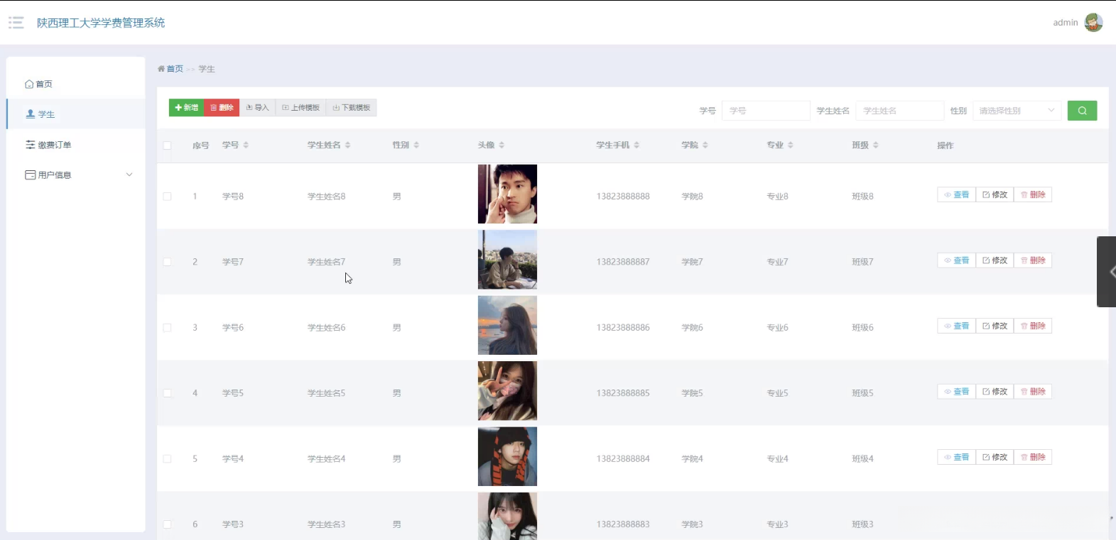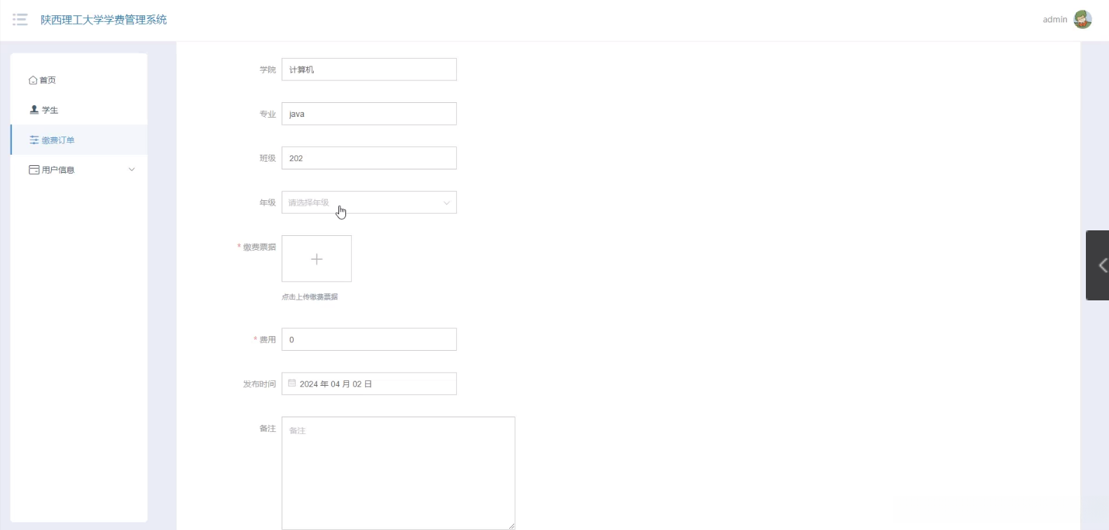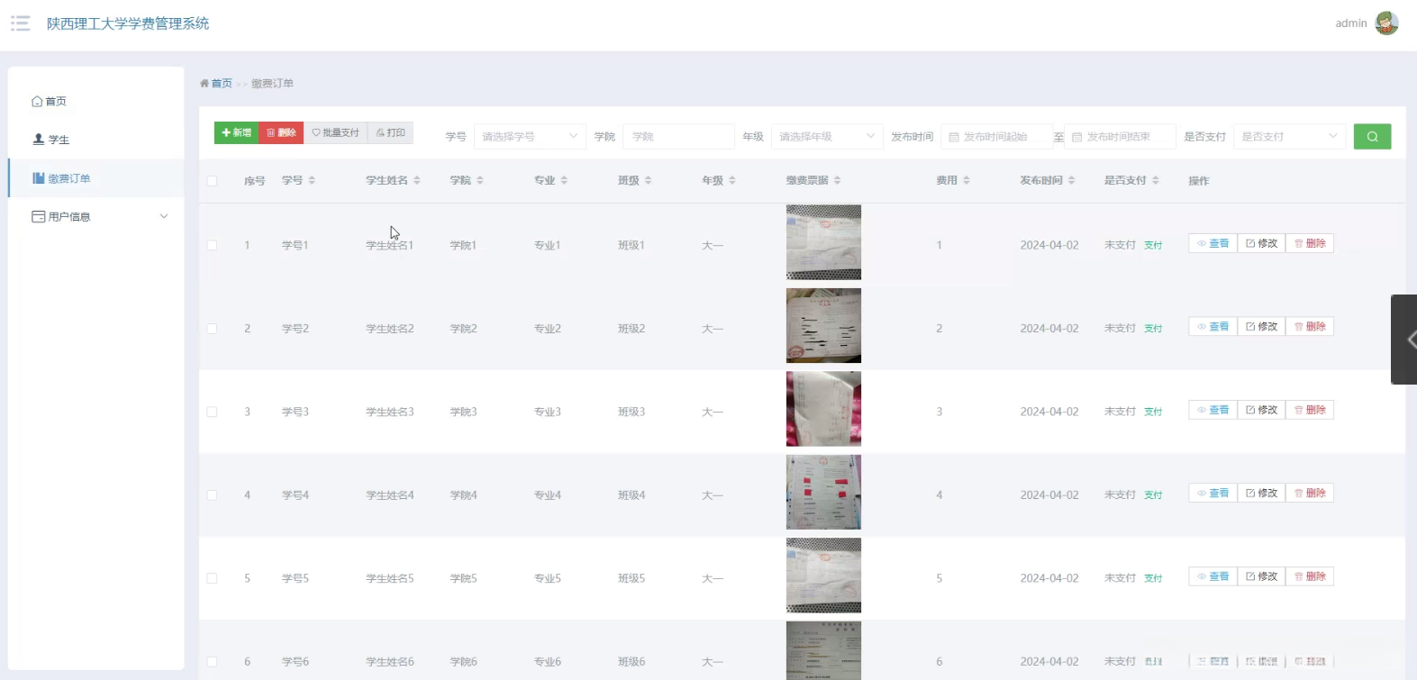 - 学生信息管理功能 :实现对陕西理工大学学生基本信息的录入、修改、查询等操作。涵盖学生姓名、学号、专业、年级等信息,确保学生信息的准确性和完整性,方便后续学费管理流程中与学生的精准对接。