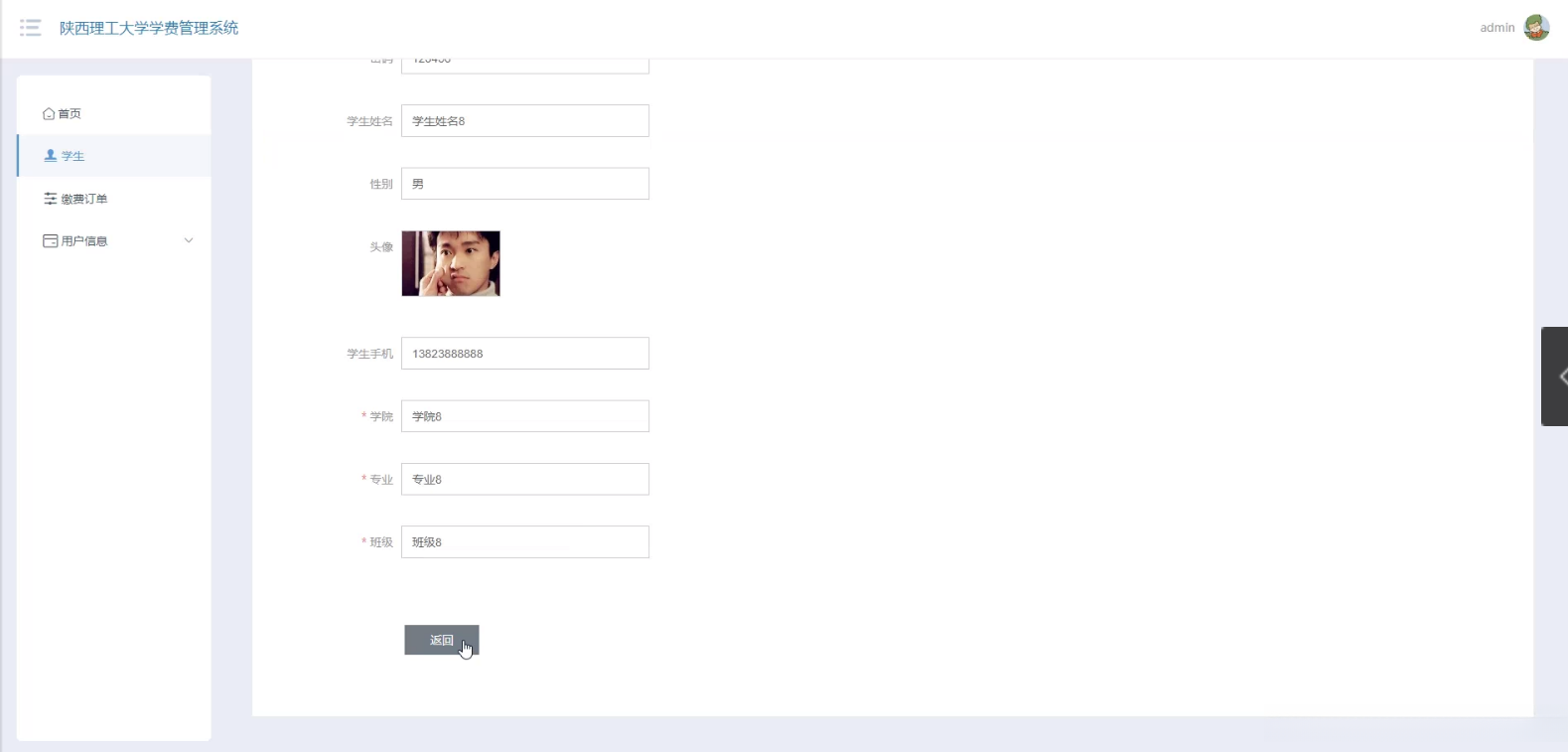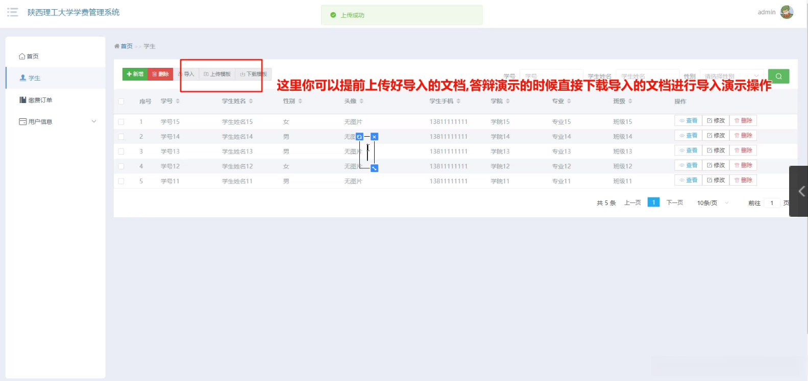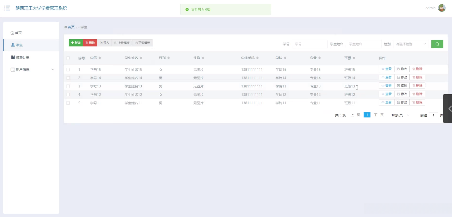 - 学生信息管理功能 :实现对陕西理工大学学生基本信息的录入、修改、查询等操作。涵盖学生姓名、学号、专业、年级等信息,确保学生信息的准确性和完整性,方便后续学费管理流程中与学生的精准对接。