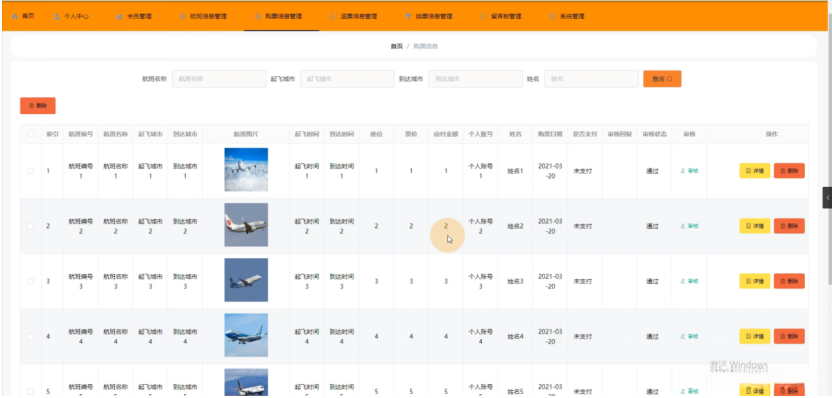 在购票信息管理页面中,在线展示有票航班的信息内容包括:索引项列表显示各项参数设置情况;在"航班号"字段可查询对应航班的基本信息;在"航班名称字段"显示完整的飞行行程名称;在"起飞城市字段"和"到达城市字段"分别展示起降机场码;在机票配图区域可预览电子版机票图片;在"起飞时间字段"显示起飞时刻;在"到达时间字段"显示预计抵达时刻;在座位号区域展示乘客座位号码;在票价金额栏显示对应舱位价格;在应付金额栏显示应付款项总额;在账户名字段填写旅客个人信息;旅客下单日期字段记录订单生成时刻;支付状态栏反映订单支付进度情况;处理结果区显示系统处理反馈信息并生成相关报告文档;以及相关信息区域包含其他辅助数据如订单确认单等,并提供删除按钮区域供用户进行数据删减操作(如图4-10所示)。