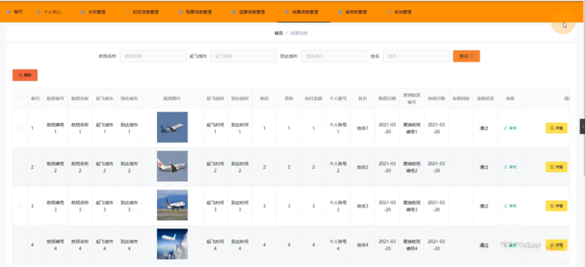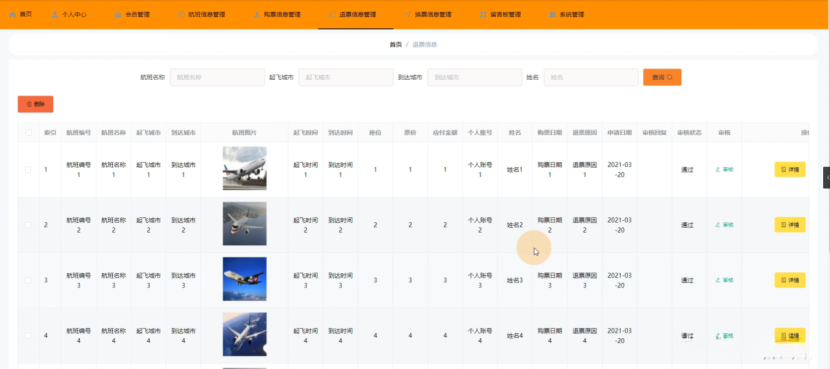 退票信息管理系统,在该页面中提供了详细的退票相关信息列表(包括航班相关数据),如航班编号对应的信息如航班名称以及起飞城市与到达城市等基础数据,并包含有完整的机票详情(如航班图片信息)以及各项费用计算结果(如座位号与票价),同时支持用户查询个人账户内的订单情况(如姓名与购票日期)。此外,在线提交后的各项处理结果包括审核回复(即审核结果反馈)、审核状态的实时更新以及最终的审核处理流程。