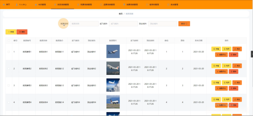 在该航班信息管理页面上提供详细的信息展示服务,在线系统中可实时查询各项参数数据包括但不局限于记录列表(即索引)、飞行序号(即航班编号)、飞行器型号(即航班名称)、飞行器描述(即航班简介)、起飞地点(即起飞城市)、抵达地点(即到达城市)、机长照片(即航班图片)、离港时间(即起飞时间)以及到站时间(即到达时间)。此外系统还支持座位配置查询与设置功能以及票价设置功能,并提供乘客服务功能包括但不局限于阅读评价(即查看评论)、增减功能操作(即购买修改或删除等操作),具体操作界面如图4-9所示