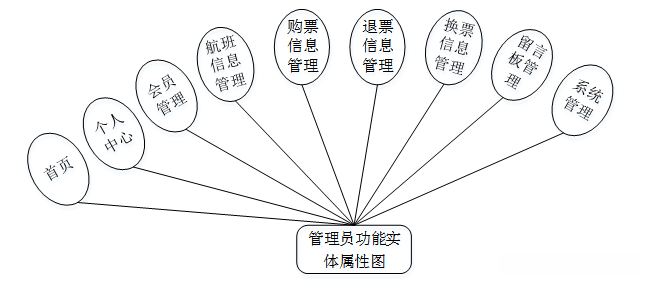 管理员管理功能包含以下几个主要模块:起始页面(home page)、个人中心界面(personal center interface)、会员管理系统(member management system)、各类航班行程安排及相关服务(airline schedule and related services)、订单支付管理系统(payment system)、退票处理系统(cancel system)、兑换系统(exchange system)、用户反馈管理系统(user feedback management system)以及后台管理系统(backend management system)等