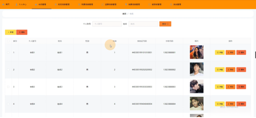 通过管理员登录进入航空公司机票预订管理系统可查看主页、个人信息中心、会员服务、航班信息查询、订单支付查询以及退费流程查询等相关内容,请参阅图4-7所示