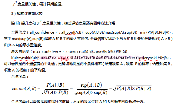 为了识别规则的有趣性, 借助相关性指标来扩展关联规则的支持-置信度框架. 除了基于支持度和置信度的标准外, 同时考虑项集A与B的相关性评估. 具体而言, 常用的相关性评估方法包括: