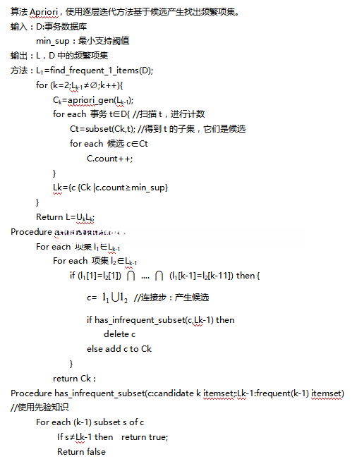 挖掘布尔关联规则发现频繁项集的Apriori算法如下: