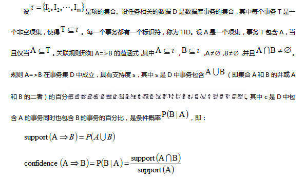 由若干项目组成的集合被定义为"项集";其中包含k个项目组成的"子集"则被称为"k-项目集"。“子集”的出现次数即为该"子集"的相关属性之一——其被定义为"频率计数值"或者简而言之就是所谓的"支撑程度计数"。“子集”的支撑程度又被统称为"相对支撑程度";而所涉及的具体事务数量则被视为它的绝对支撑程度。“当某一个特定子集I"在满足预设条件下的'最小支撑程度阈值'时(即相应地这个子集中具体存在的事务数量达到了设定好的'最小支撑程度计数值'),那么我们就称这个特定子集I"为一个'频繁项目组'"。(通常用L_k"来表示所有大小等于k"的所有频繁项目组构成的一个总称)。基于关联规则挖掘的基本流程大致分为两个步骤: