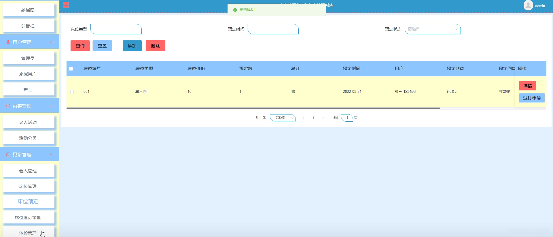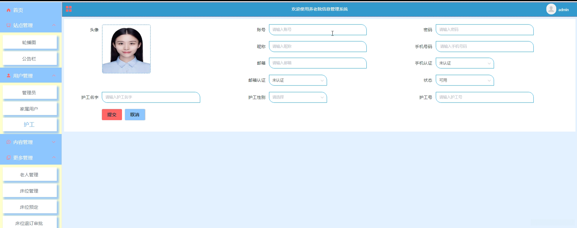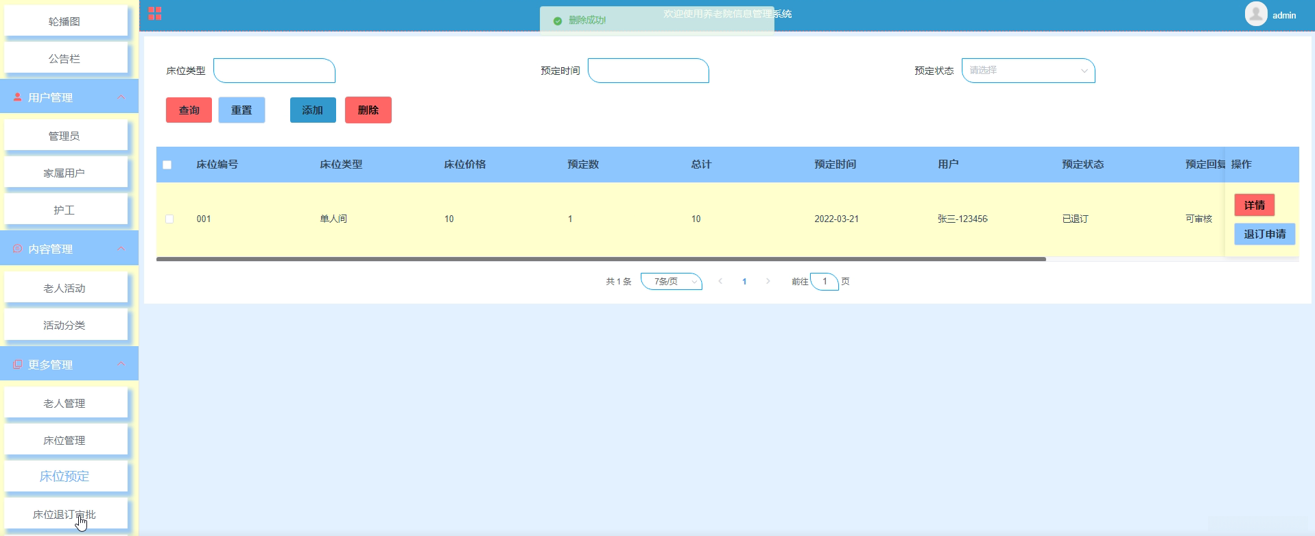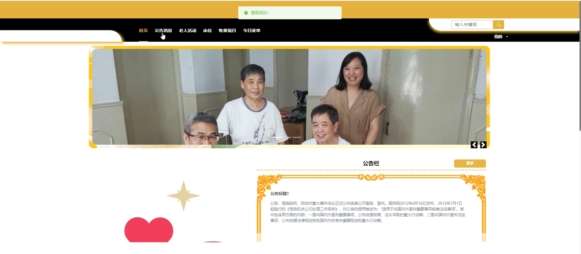 养老院信息管理系统实现系统主要功能:首页、系统用户(管理员、护工)模块管理(老人管理、房间管理、收费管理、床位预订、床位退订审批、今日菜单、欠费通知)管理。养老院内部管理系统以院方人、财、物综合管理为核心,包含、房间管理、收费管理、健康情况、收支报表管理层决策智能分析等功能,系统采取一体化的运营模式,可作为提高院方综合运营能力的有效手段。