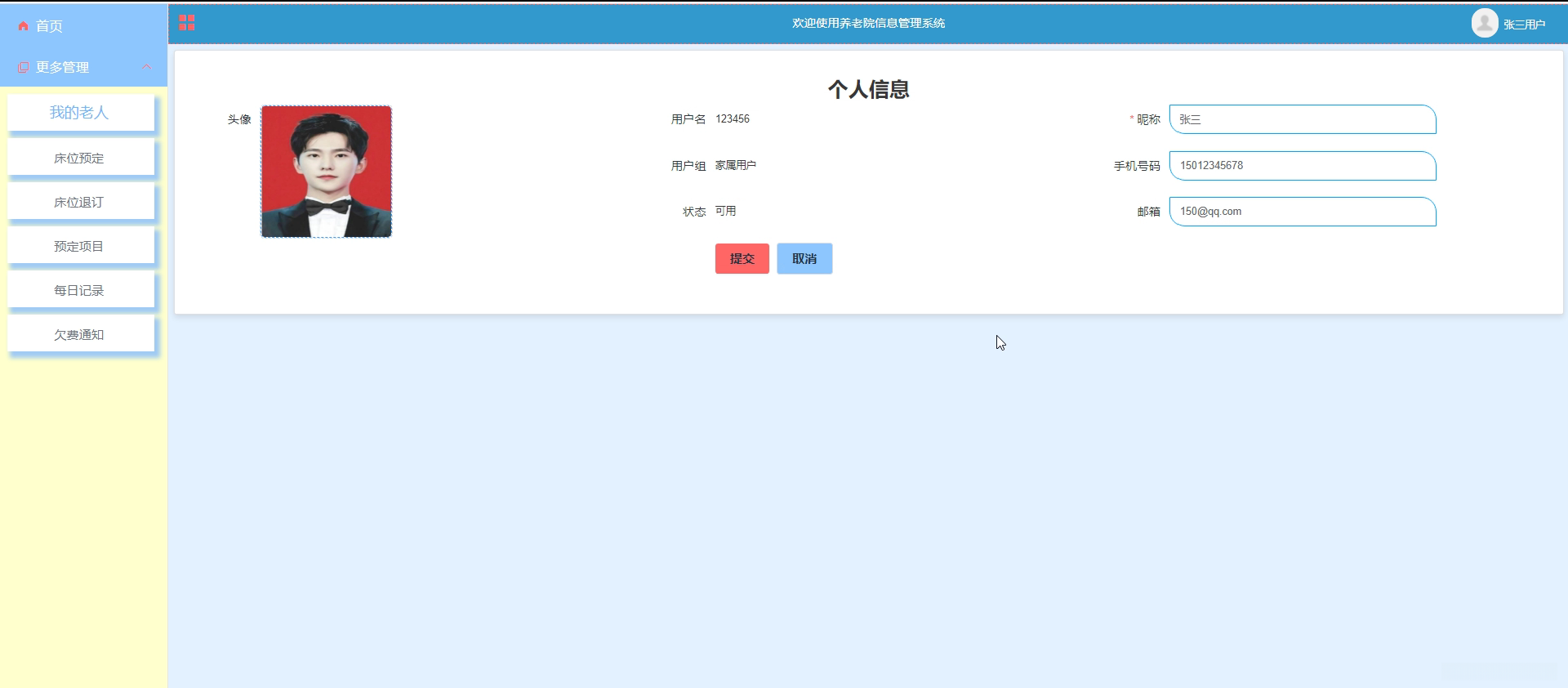 This design mainly realizes the nursing home information management system with the advantages of humanization, high efficiency and convenience, and realizes the functions: home page, system user (administrator, nursing worker) module management (elderly management, physical examination record management, charge management, health reporting, bed reservation, bed unsubscribe approval, bed management, charge item management, today's menu management, arrears notice) and other functional modules. The system communicates with the server through the browser to realize the interaction and change of data. You can operate the system and realize data communication management by moving your fingers through a computer. The safety, stability and reliability of data are fully considered in the design process of the whole system, and the operation process is simple. Through scientific management and convenient service, the system improves work efficiency and reduces errors and omissions in data storage.