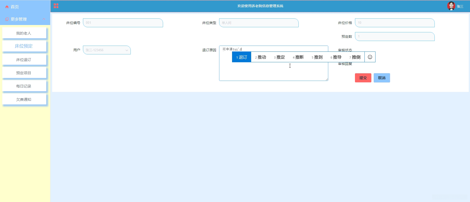 用户提交床位预订,用户在chuangweiyuding_list查看床位信息,点击预订,跳转至chuangweiyuding_add.jsp,添加yuding 表中,然后调用CommDAO的insert方法将床位预订插入预订记录表中。