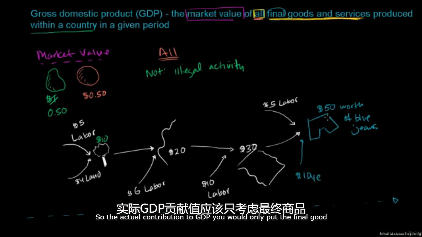市场价值:前年一个梨的价格为1美元及苹果为半美元;而今它们都降至半美元;在计算GDP时采用的是这两个价格的数据;换句话说,在这一过程中市场的调节机制决定了商品的价值