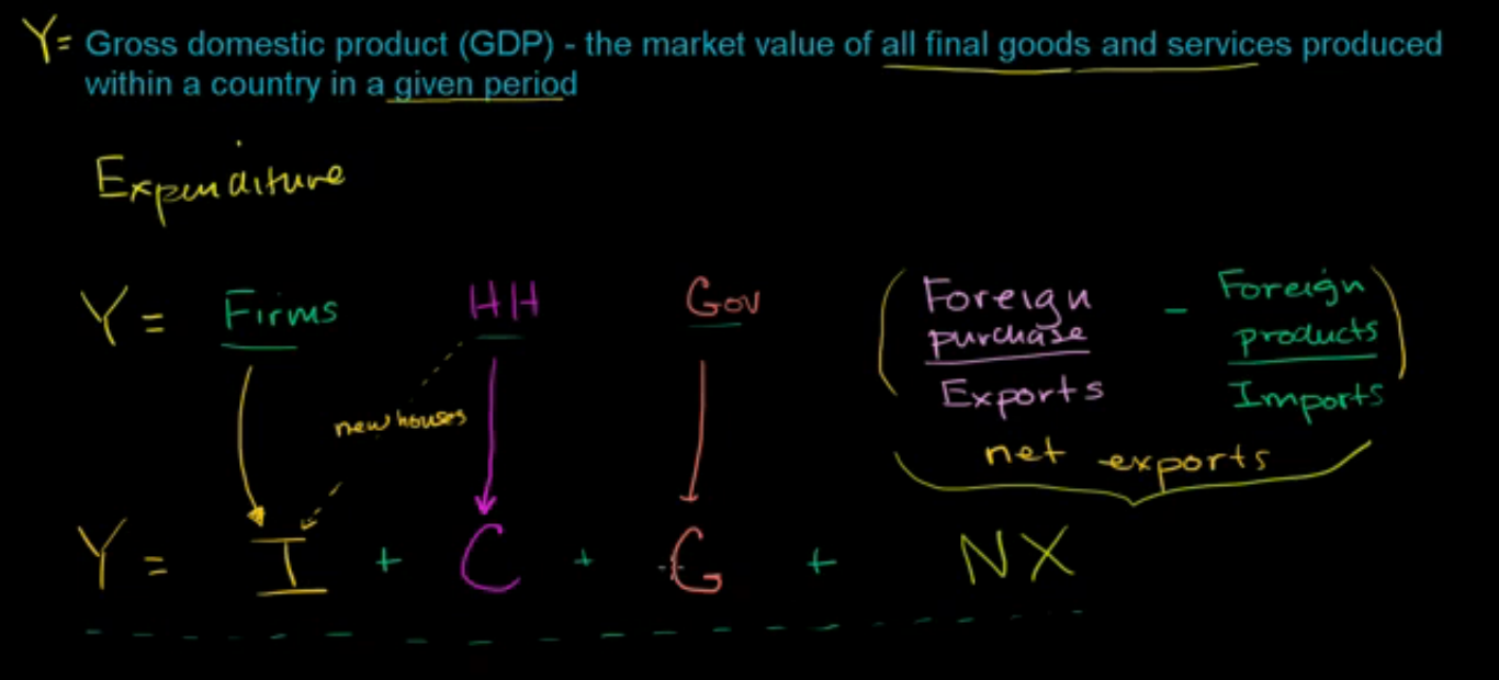 从支出的角度分析GDP构成时,则假设GDP=Y。其中Y主要由企业、家庭以及政府三部分支出总和构成。此外还需加入净出口这一项:净出口又包括两个方面:一是来自其他国家在本国内的需求(Export出口),二是本国内需求用于其他国家生产的货物(Import进口)。