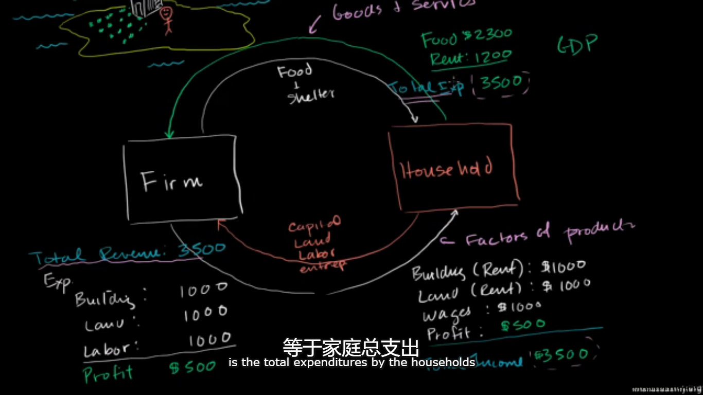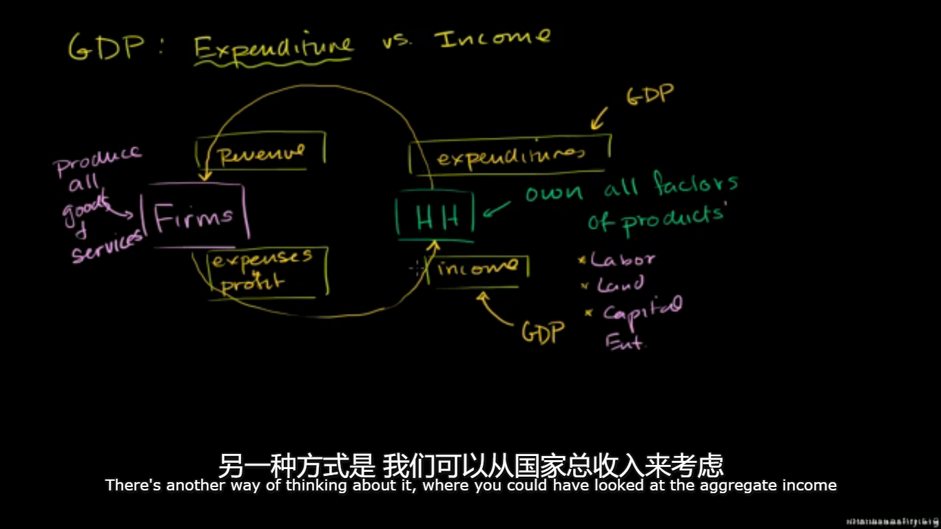 如果世界上只有一个人参与经济活动,则他的收入必定与其支出相抵消。在衡量GDP时,则可以选择衡量家庭总支出、家庭总收入或公司的运营收益。则可得出GDP等于家庭支出、公司收入以及家庭收入之和。
