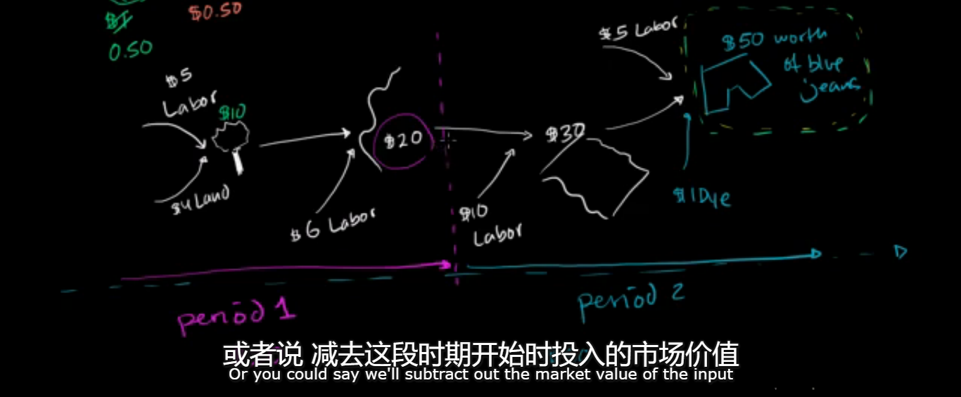 假设某个商品跨越了两个不同的GDP计算周期(如图所示),其中,在period1中计入了棉线的价值为20美元。牛仔裤的价值为50美元,在period2中被计入时需要扣除初始投入的商品价值(即棉线的价值),因此,在period2中的最终GDP值确定为$30。