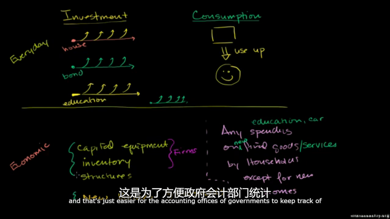 | 经济学 | 资本设备:机器人,装配线. 库存 (公司行为) 建筑 建造新房子 (家庭行为) | 家庭在最终商品和服务上的消费除了购买新房子 |