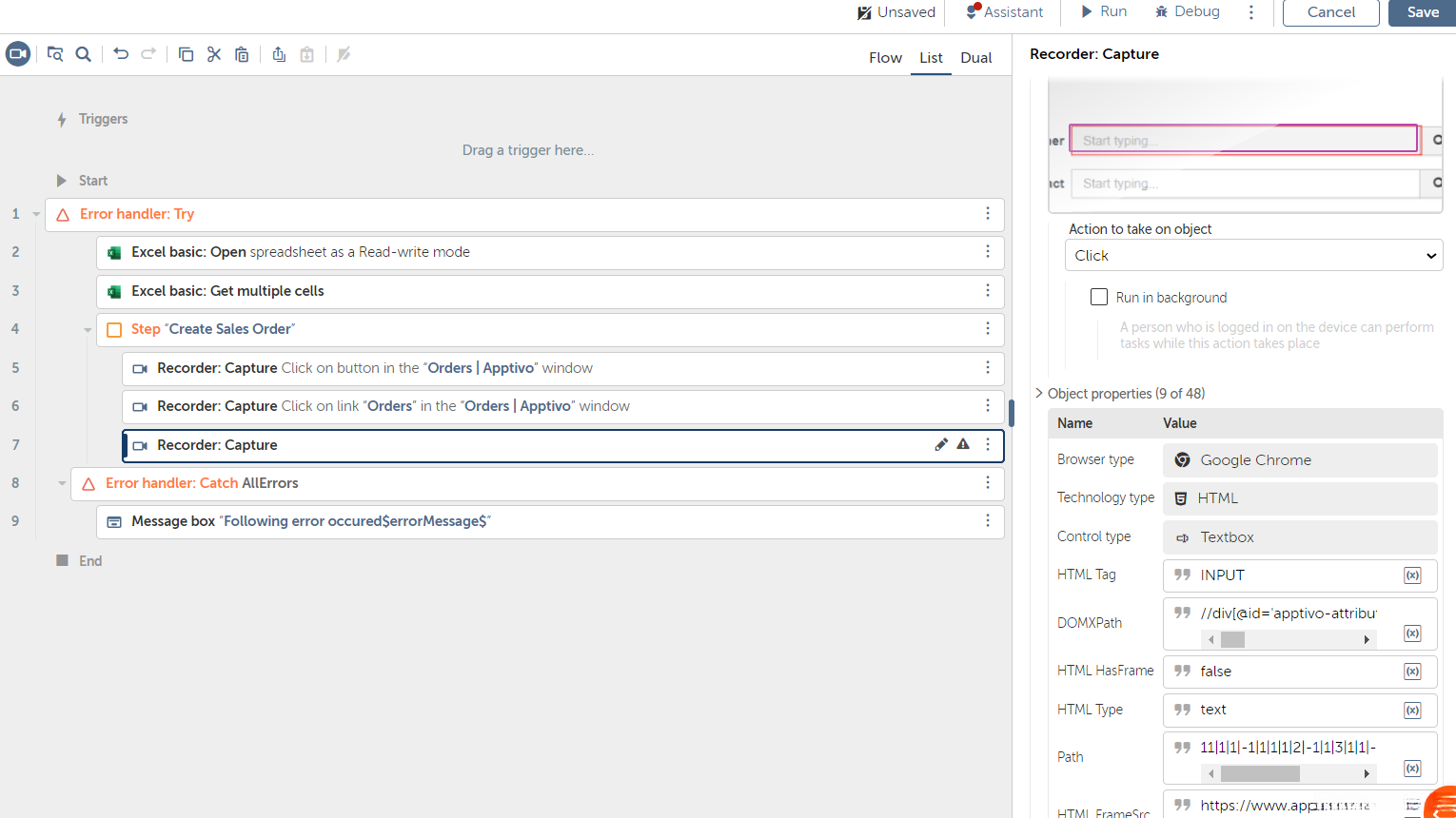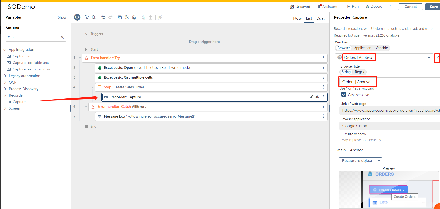- 请单击捕获对象按钮并指向Apptivo上的订单选项进行操作。请注意,在这种情况下,请确认Object属性如屏幕截图所示已正确配置。