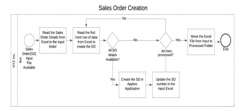 在本项目中,我们计划配置一台A2019机器人以从Excel表格读取SO详细信息,并将这些信息保存到Input文件夹中.该机器人将逐行处理SO数据,并将其处理结果导入Apptivo Order应用程序.每当Apptivo Order应用程序接收一个订单时,机器人程序会提取相关SO编号并更新对应的Excel电子表格.在所有SO数据均被成功处理完成之后,机器人程序会将完整的电子表格转移至processed文件夹.