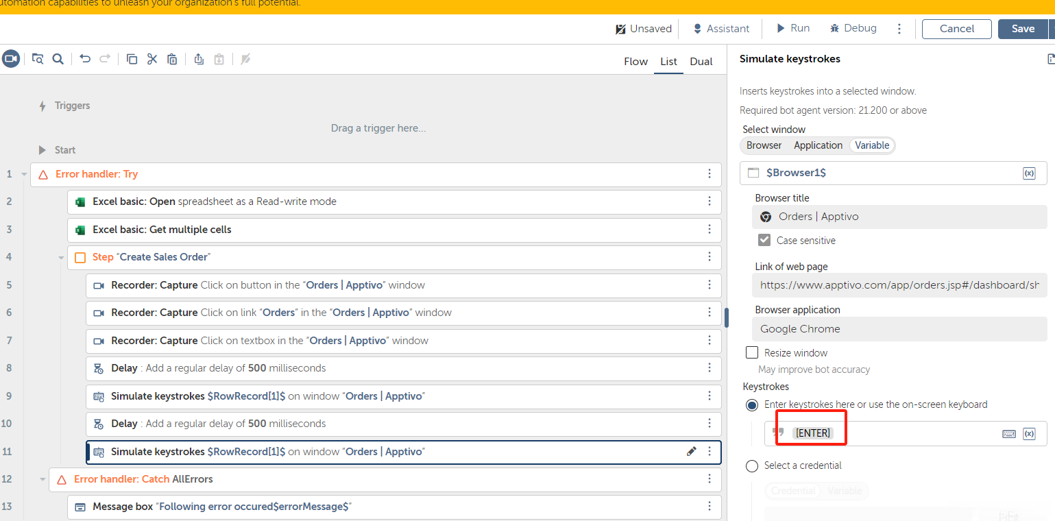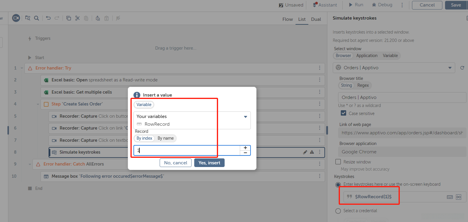 现在,请我们为输入字段赋值客户名称。为此目的,请我们计划添加模拟键盘操作步骤。在属性设置中,请选择相同的订单窗口,在Apptivo-Google Chrome窗口位置上。对于Keystrokes部分,请单击输入框中的Insert a variable选项,在此处选择By index设置为1的变量RowRecord。如需进一步了解,请参考以下步骤: