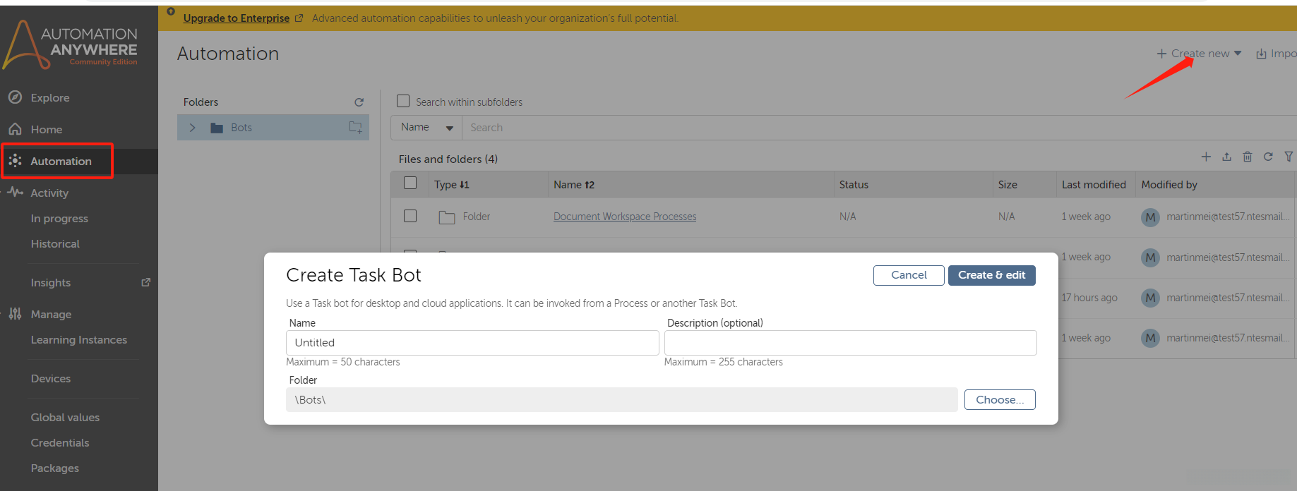 为了实现这一目标,请导航至左侧面板的 Automation 选项,在右侧执行 Create new 操作。