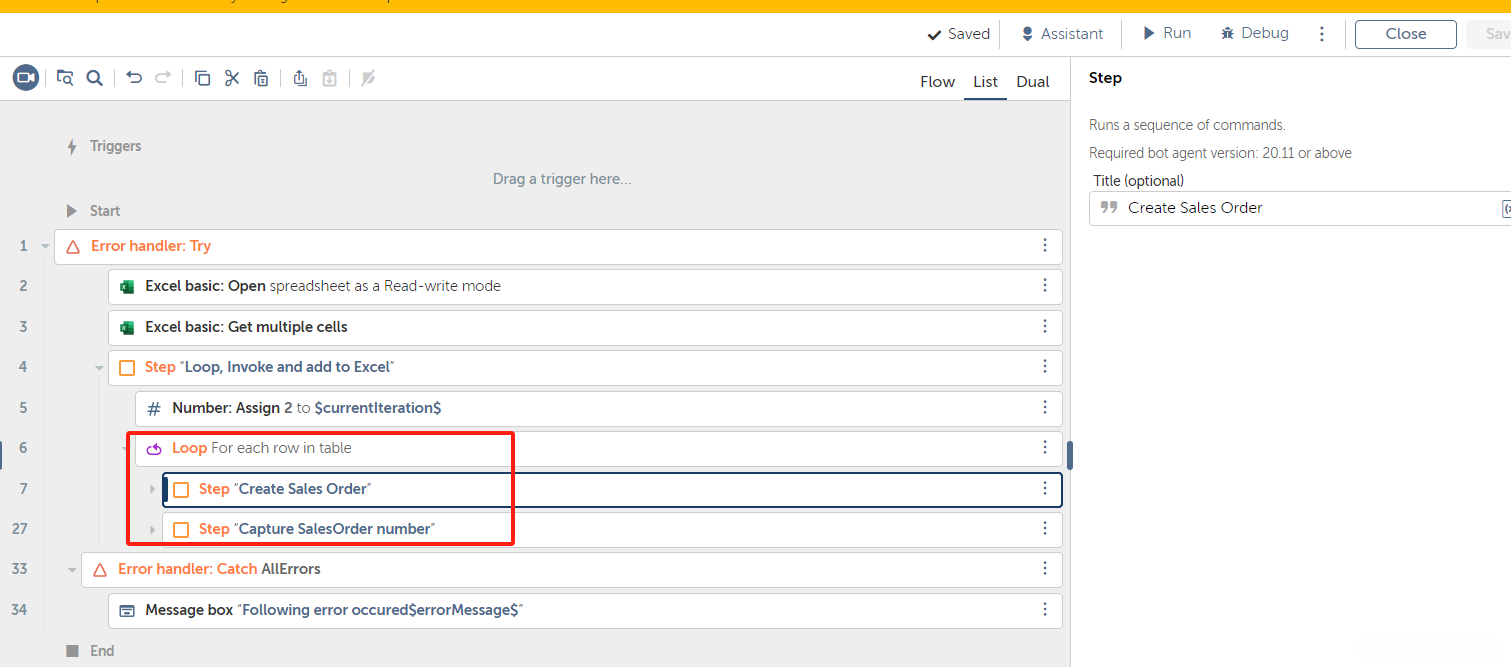 在循环过程中首先放置step create sales order 到loop内部,并同时处理另一个步骤