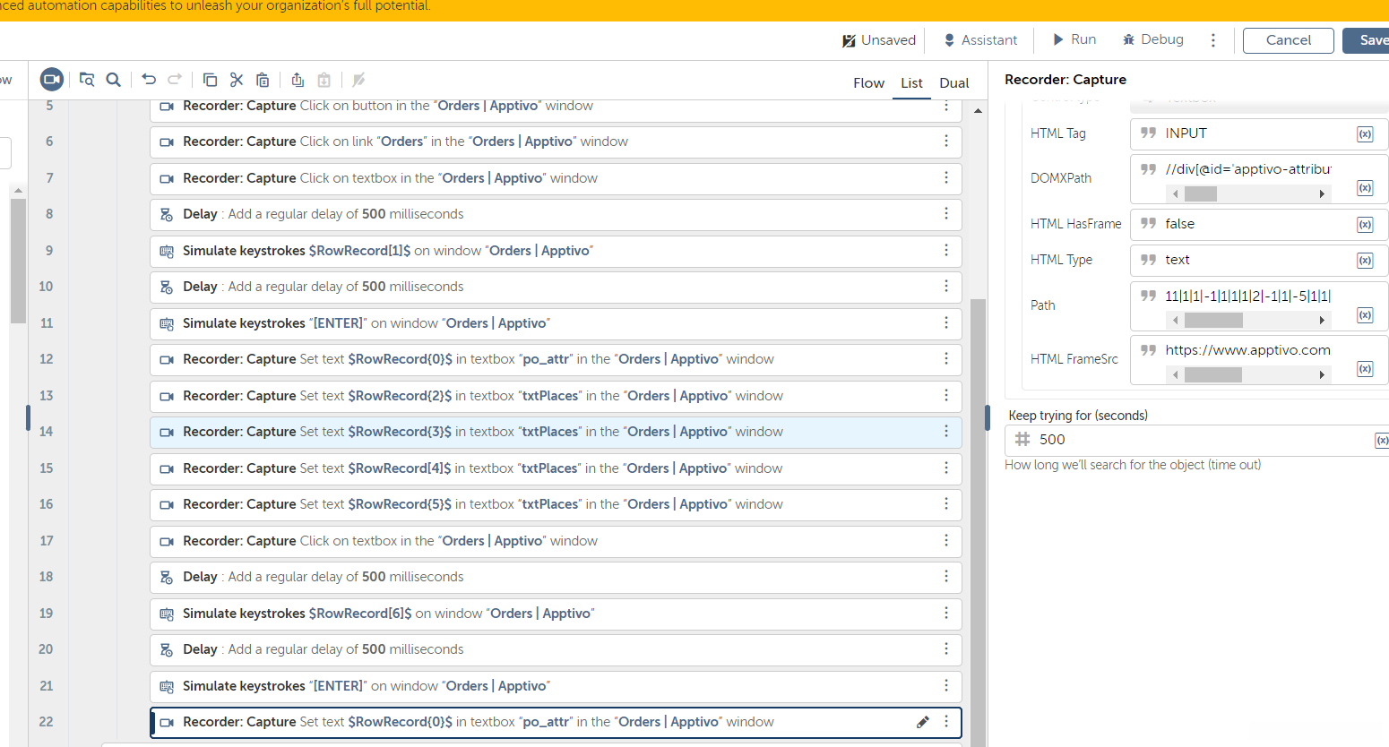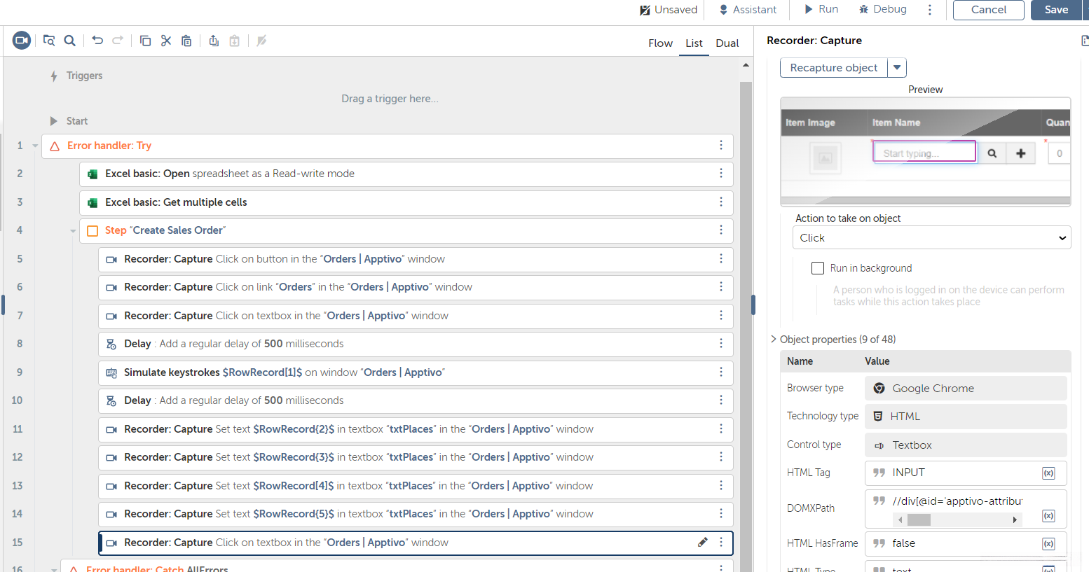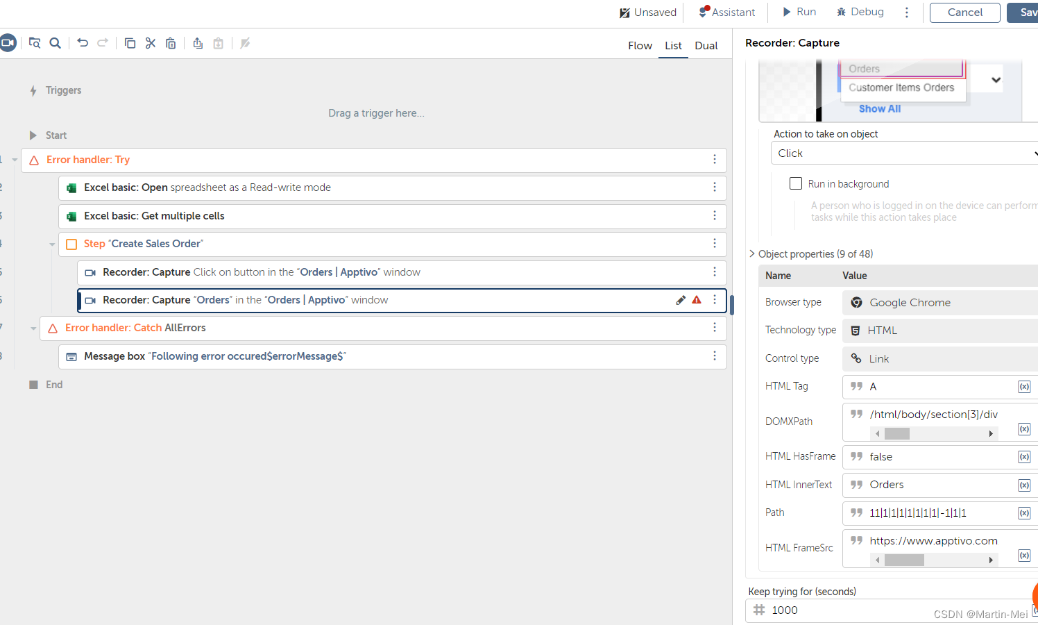 - 接下来,请单击Apptivo平台上的Order选项按钮。为此,请增加一个记录器来捕获操作过程,并选择与当前订单相同的Google Chrome窗口作为操作源。