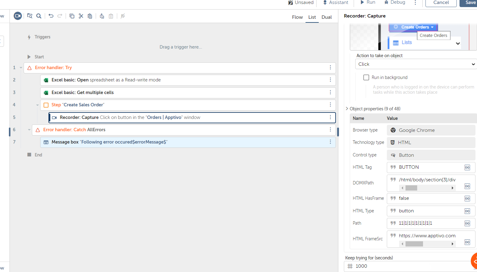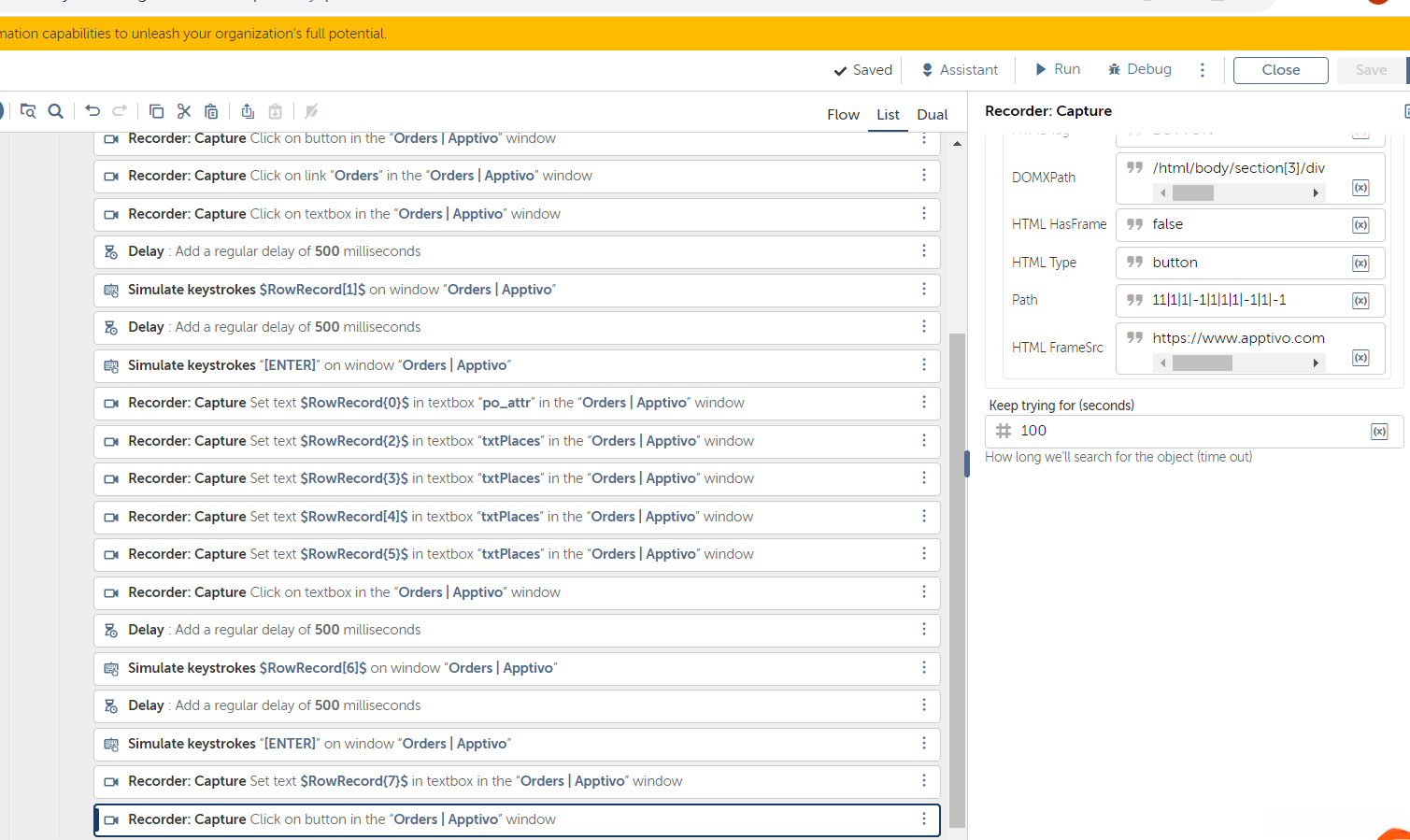 - 现在让我们单击“确定”按钮,以便机器人可以执行下一笔交易。为Apptivo Orders窗口添加一个新的Capture操作,并指向OK按钮。对象属性看起来与If操作的属性类似。请确保在“操作”属性中选择“单击”。