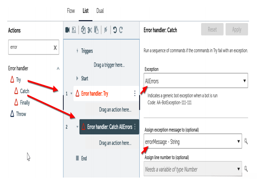 让我们切换到画布上的列表视图,并从异常处理开始。