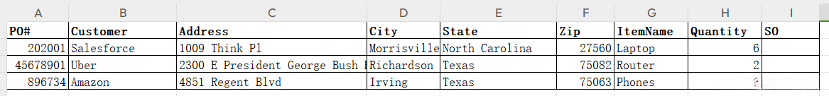 Excel SO文件将包括PO#(订单编号)、Customer(客户信息)、Address(地址信息)、City(城市)、State(州)、Zip(邮政编码)、ItemName(物品名称)、Quantity(数量)以及SO列的具体内容,请参考以下详细说明。