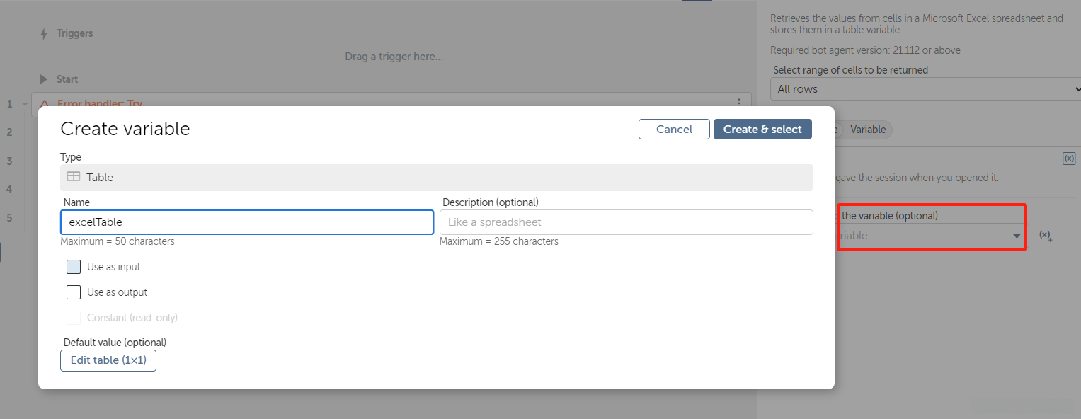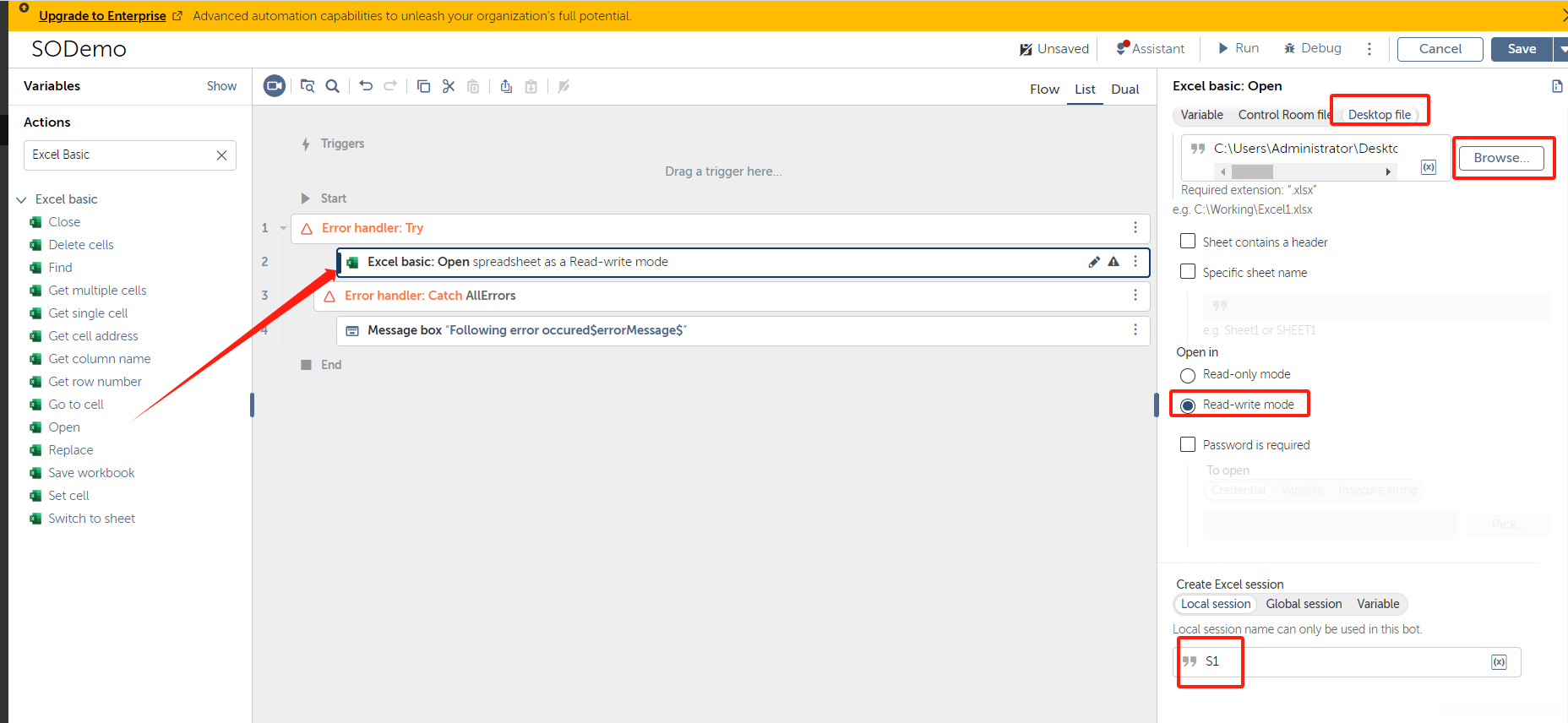 在Excel中实施基础功能:获取多个单元格的操作;随后,在该操作中配置其属性为Session name:S1以及Loop-through:All行;接着生成一个名为excelTable的Table类型变量,并将其值赋值给该变量
