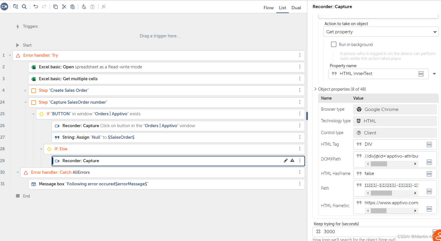 - 为了实现这一目标,请首先定位并拖动错误处理程序至Try操作的位置。在后续章节中我们将在这个Try块内整合大多数自动化步骤。