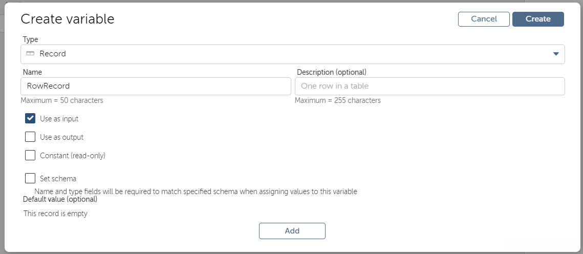 - 创建一个记录类型变量,并将其用于从Parent bot获取所需数据。转至左窗格Variables部分,在Actions和Triggers下方找到Add按钮并点击以新增该记录。