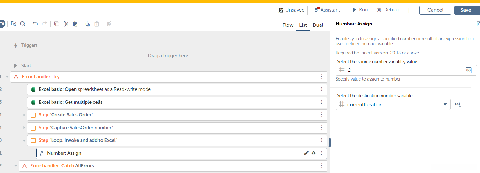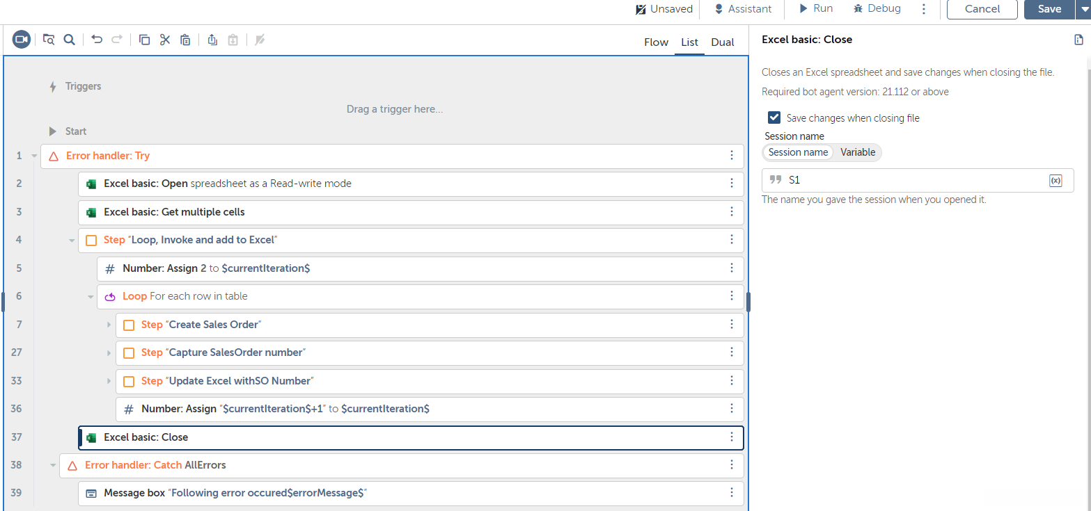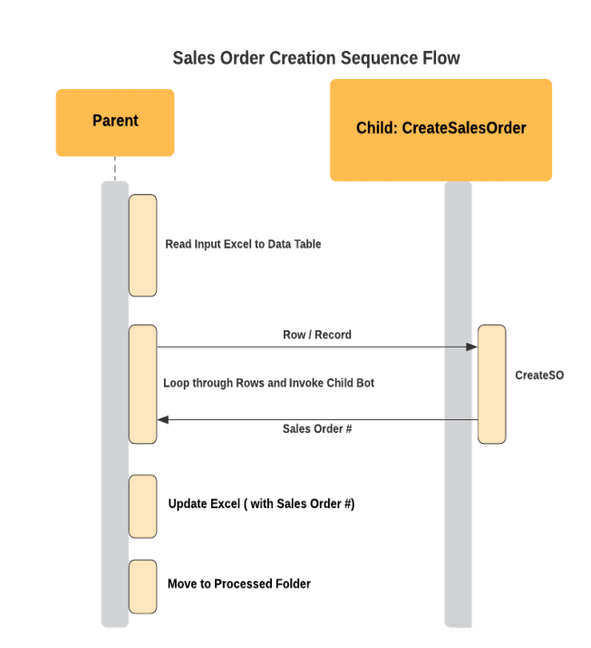 如图所示, 我们首先在Parent bot中打开并读取Excel文件. 接着, 数据被系统性地提取后存入数据表变量中. 然后依次遍历数据表中的每一笔记录, 并利用Child-CreateSalesOrder机器人程序生成相应的SO订单编号. 最后由Child机器人程序将生成的所有SO订单编号反馈至Parent机器人程序.
