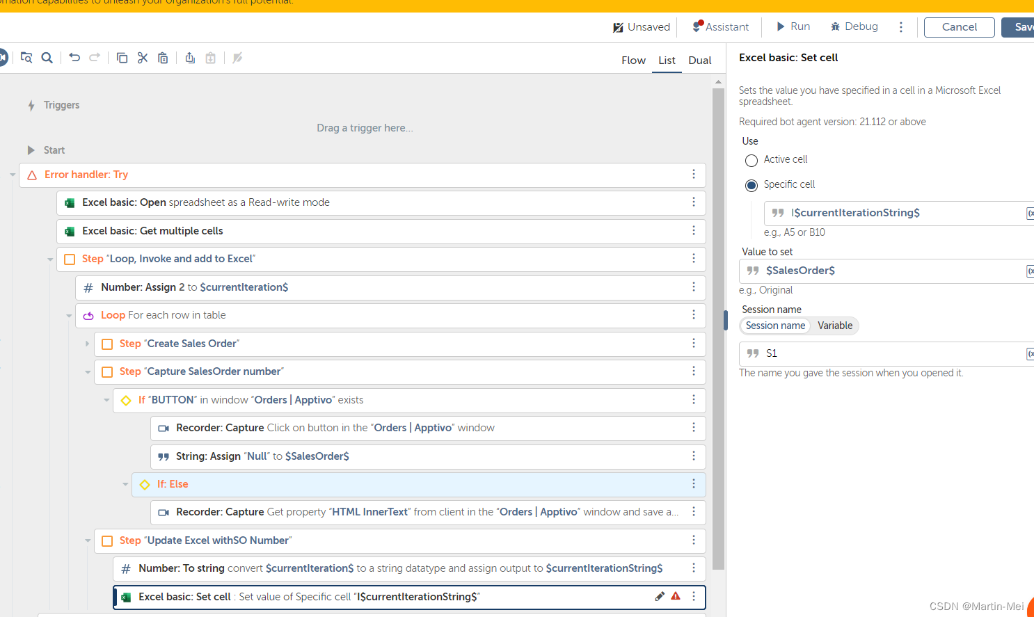请利用Child bot获取的SO编号,在工作表中的第I列建立一个特定区域用于存储这些编号。向Excel中执行基础单元格设置操作,请确保以下配置:将Session名称配置为S1,并指定该单元格的内容设定为IcurrentIterationString。这样操作后,在当前迭代字符串的基础上自动递增生成如I2、I$3等序列号。