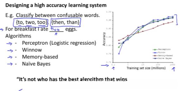 研究表明,在特定条件下收集了大量数据,并通过某种学习算法进行训练,是一种有效的方法来生成具有良好性能的学习模型。而这种情况通常发生在这些条件适用于你的具体问题,并且你能够收集到充足的数据。这也是一种非常有效的途径来构建高绩效学习系统。