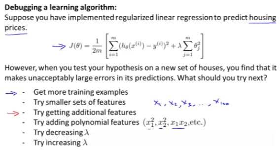 使用一个预测房价的学习例子。假设你已经完成了一个带有正则化的线性回归模型,并且这相当于最小化了目标函数J。如果在获得学习参数之后,将假设函数应用于一组新的、未见过的数据集,并发现对新数据的预测存在显著偏差。