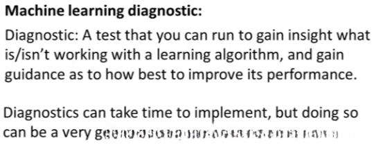 在机器学习领域中,这类方法被称为"机器学习诊断技术"。所谓"机器学习诊断技术"的核心在于,它是一种用于评估和优化算法性能的方法。通过实施这一评估机制,我们可以深入理解某种算法的有效性。此外,这也为我们提供了关键的指导原则:在优化算法时应采取哪些策略才能取得最佳效果?实施这些评估机制往往需要投入大量时间和资源,但总体而言,这些工作投入产出比很高。