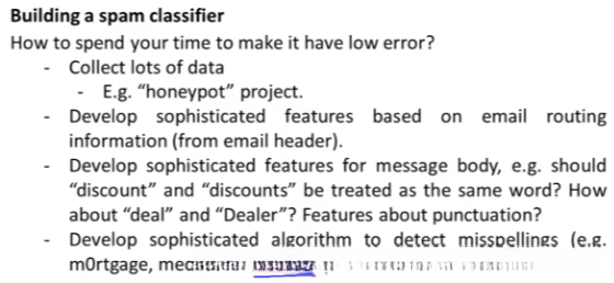 在垃圾邮件分类领域中存在一个名为"Honey Pot"的项目,在这个项目的框架下可以创建一个虚假的电子邮件地址,并有意地将其发送给发送垃圾邮件的人。这样一来,就会产生大量用于训练学习算法的垃圾邮件样本。观察到这一点后,我们就可以收集成百上千份这样的垃圾邮件来进行训练和算法优化。然而,在之前的课程中我们了解到,大量数据可能有助于提升模型性能,但也可能带来负面影响。