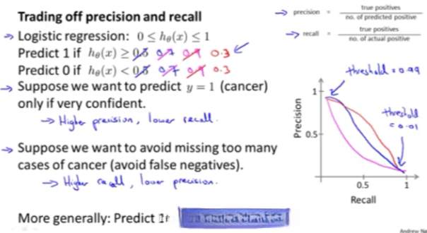 当我们设定临界值P(y=1|x) \geq 0.9时 为了测试其准确性 我们仅限于少数病例标记为y=1 这些病例中绝大多数病例确实患有癌症 因此该模型具有较高的精确度 然而其召回率会有所降低的原因在于我们的设定旨在尽可能减少误诊。