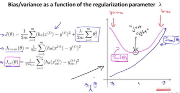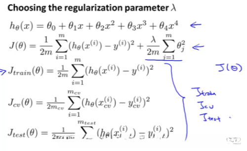 这里具体来说我们的模型以及所涉及的学习参数 最优化目标都是这样的构建方式 在训练过程中 我们特别关注Jtrain Jcv Jtest这几个指标的表现 同样值得注意的是 模型在训练阶段与测试阶段的表现指标与非正则化版本(即Jθ)保持一致 这一点在后续选择最优λ值的过程中并不会影响我们的计算 因为在这种情况下 我们始终只关注最小化代价函数Jθ的同时也考虑到了引入正则化项的影响