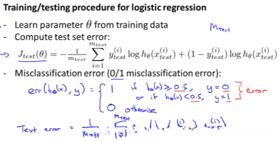 你通过以下步骤训练与测试你的学习算法:首先利用70%的训练集进行学习并获得参数θ;同时使训练误差J(θ)达到最小值;然后利用30%的测试集计算测试误差以评估你的学习算法的效果。值得注意的是,在线性回归问题中我们采用损失函数作为评估标准,在逻辑回归问题中则采用误分类比例(也被称为0/1错分率)作为评价指标。这种差异主要体现在误分类比例这一指标上:它不仅考虑了预测结果是否正确(反映模型对正负类样本的分类效果),而且量化了模型预测结果与真实结果之间的差异程度
