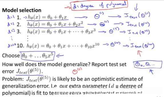 在当前情况下,我们遇到的一个困境是通过这种做法难以公平地推断假设在一般情况下的适用性。这一困境的原因在于使用了测试集来确定多项式次数d的过程与假设拟合的目标存在不一致。因此,在这种情况下我们选择了能够使多项式次数d最佳匹配测试集特征的那个值。这意味着所选参数向量θ(5)在训练过程中过于关注测试集的表现而可能忽略了在真实数据上的泛化能力。