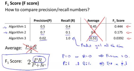 与之不同的是,有一种结合查准率与召回率的不同方式,被称为F值,其具体数值是这样的.在这个例子中,F值的具体数值也是这样的.我们可以通过这一指标来判断各个算法的表现:其中,算法1具有最高的F值,紧随其后的是算法2,最低的是算法3.因此,基于F值的评估结果可知,在这几个算法中表现最佳的是算法1(即F1值),其次为算法2(即F值),而算法3则表现最差.F值也被称为F1分数,通常写作F1分数.但是一般情况下人们只称其为F分数.它的定义会综合考虑查准率与召回率这两个指标的平均值.然而,F分数会对较低的查准率或召回率情况赋予更高的重视.因此,F分数的分子实际上是查准率与召回率的乘积.由此可见,如果查准率为0或者召回率为0,F分数也会等于0.这表明,F分数完美地结合了这两个关键指标.值得注意的是,虽然有多种公式能够同时衡量查准率与召回率,F分数只是其中之一.然而由于历史原因及惯用习惯,在机器学习领域仍广泛采用这一术语.F分数本身并无特别意义,因此无需过分担忧它命名的原因(如为什么叫作F分数或者F1分数).但它是评估系统性能的有效工具:因为无论是查准率为0还是召回率为0,F分数都会给出一个很低的结果.F分数越高表明系统性能越佳:只有当两者均接近于1时才能得到最高的得分(如P=0或R=0的情况下,F分数同样等于0).对于达到完美状态的情况,P=1且R=1时将获得最高的评分(即(1×1)/(2×( (1/2)+(1/2) )) = 1).通常情况下,F分数会在回归模型等场景中取得介于0到之间的常见数值