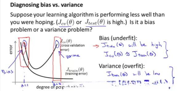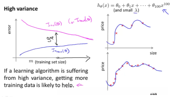 高方差 - 过拟合 - 训练误差会很小 - 交叉验证误差》训练误差 - 多项式次数太高