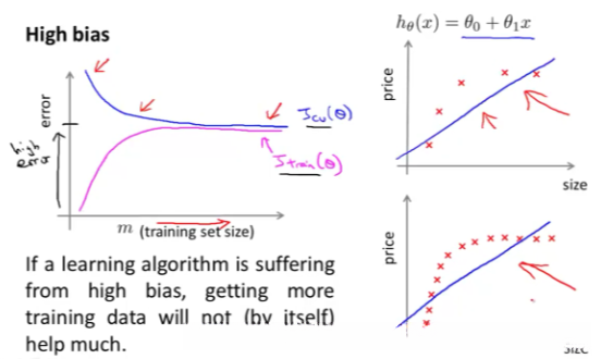 即使你不断提升m值 你基本上还是会获得一条与之前差不多的直线 当训练集样本容量达到或超过某个特定阈值时 交叉验证集误差和测试集误差会趋于稳定 这样你会从而获得对数据最佳拟合的那条直线 高偏差的情况表明 当交叉验证集和训练集之间的误差都很大时 这种情形反映出你的模型可能过于简单或欠拟合 单纯增加更多的训练集数据并不能改善算法性能 这种观点提醒你要避免将大量时间浪费在试图收集更多训练样本上 因为额外的数据在此情况下并无价值