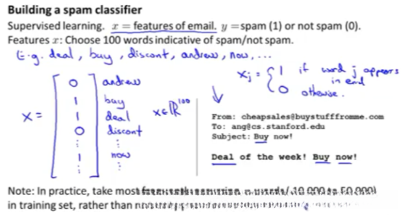 在进行监督学习时 首先需要确定的是 如何基于邮件的特征 构造向量x 在训练集中 包含特征x以及对应的标签y 从而能够训练出一种分类器 例如 通过逻辑回归方法实现