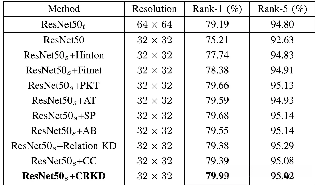 如表所示,在经过迁移学习的CIFAR-100数据集上的低分辨率图像分类任务中,CRKD模型表现出色地超越了基准模型(teacher model)。该结果验证了其不仅成功继承了教师网络的知识架构,并且在利用低位分辨率数据时能够捕获多层次的空间特征。