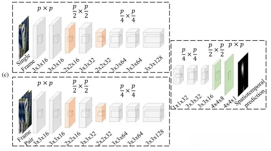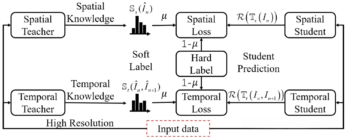 在航拍视频图像显著性分析中,受限于机载硬件的分辨率限制(最高可达1280×720)以及计算能力与存储资源的制约(最大可降至32×32),研究团队不得不采取分辨率降维措施。该系统采用时间特征与空间特征解耦技术,在低频域构建基于相邻帧对 (��,��+1) 和单帧图像 �� 的低分辨率时间学生模型与高分辨率空间学生模型,并通过引入经过降维处理后的高分辨率时空教师特征图与显著性密度图(基于响应机制)实现了特征迁移机制的研究